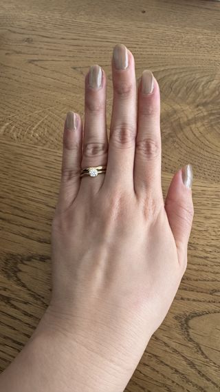 指輪の素材、形、大きさをオリジナルで選べる為、見た目、着け心地が自分に合ったものを見つけることができます。最初はピンクゴールドにしようと思っていたのですが、実際に付けてみるとシャンパンゴールドの方が馴染みがよく、気に入ったのでそうしました。また、形は多角形のものを選び、着脱のしやすさも考慮しました。