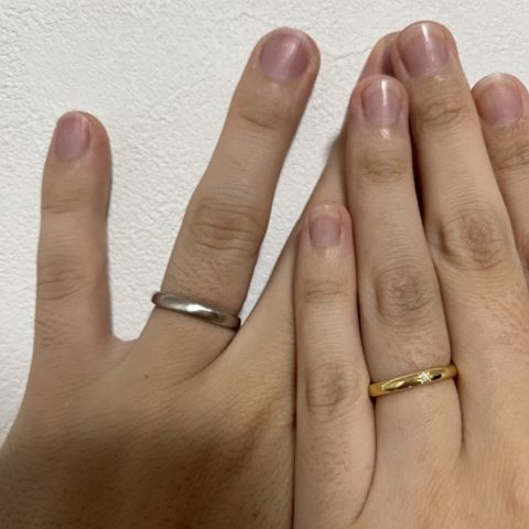 指輪のデザイン:形、色、デザイン、全て最初から決めてフルオーダーしました。 形は、少し丸みを帯びたデザインで色はゴールド、ピンクゴールドとそれぞれ好きな色を選びました。 どちらの色も主張が激しくなく、日常に付けても特別な時につけても合うような綺麗でオシャレなカラーに仕上がりました。 デザインはマット加工やダイヤモンドを加工してもらい、ダイヤモンドはキラキラしてとても綺麗に仕上げて頂きました!