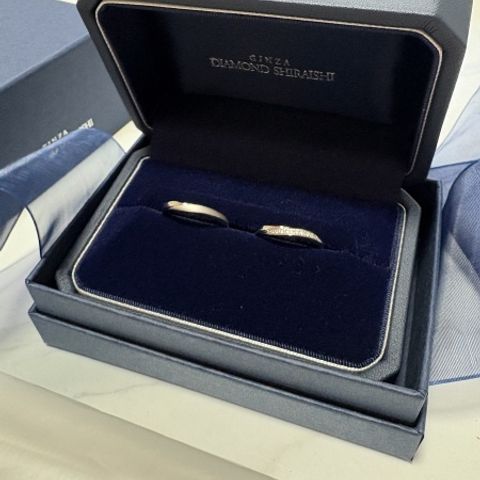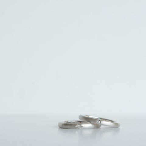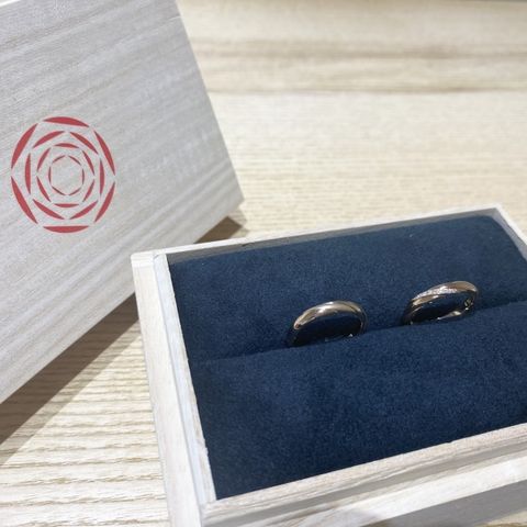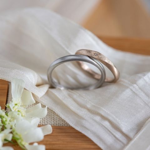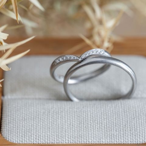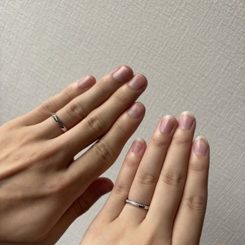 ふたりともこだわりが強いので、2人全く同じデザインではなく、お互いが気に入ったデザインで指輪を作りたいと思っていました。加工を上下でつけたり、デザインは同じだけど、加工の仕方を変えたり、補いあうようなデザインを提案していただき、ふたりとも納得のいく指輪が完成しました。