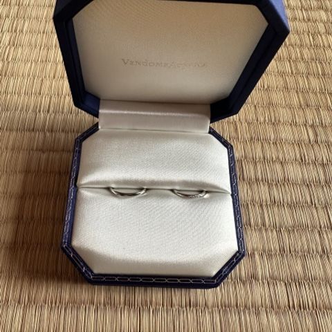 フルオーダーで2人が後悔なく選んだ指輪です! たくさんデザインや色で迷いましたが自分で納得の出来る指輪が出来上がりました♪ 婚約指輪と重ね付けをしてもとてもキラキラ輝いて可愛くてずっと見ていられる指輪です