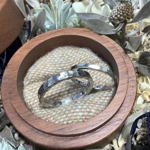 錆加工の鎚目模様という、少し変わったデザインが素敵だと思い購入しました。側面の打ち方も選ぶことができ、今回打ちっぱなしを選んだため側面から見ると揺らぎがあるのも素敵なポイントです。色味は、シルバーを着けたい彼とゴールドが着けたい私のどちらもが似合うホワイトゴールドにしました。