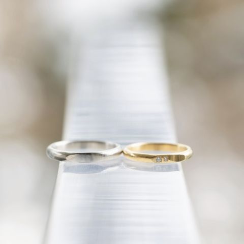 ペア感もありつつ、それぞれの好みを反映した指輪を作った。プラチナとコーラルゴールドで素材が違ったり、槌目模様とダイヤモンドという違いがあったりするが、ペアであることははっきり分かるデザイン。 コーラルゴールドはこのブランド独自のものだそうで、肌馴染みもよく素敵な色。