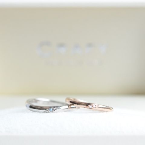 ・自分たちはシンプルだけど指がスッキリ見えるウェーブのデザインにしました。選べる誕生石は妻が2個、夫が一つにして分けられてよかったです。 ・指輪の色をそれぞれ変えました。妻はピンクゴールド、夫がプラチナにしたので、それぞれの好みやパーソナルカラーに合ったものにできました。