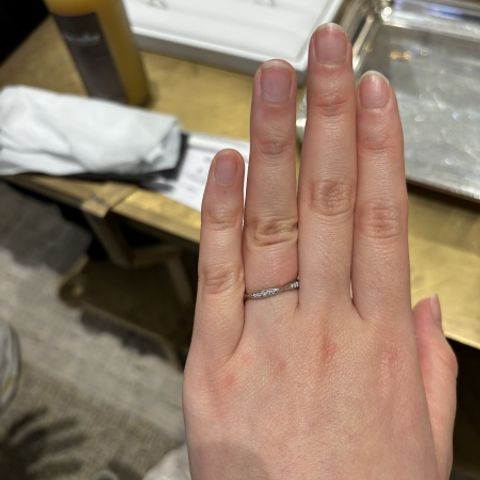 中央のダイヤだけでなく、その左右のリング部分にもキラキラと光が入るデザインが素敵でした。ストレート気味ですが、デザインによってウェーブも見えます。さりげない指輪というよりは、とても存在感があり、特別な日に付けたくなるような指輪です。
