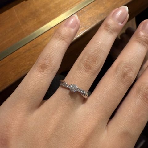 お姫様のような、台座に腰かけたダイアモンドが特徴の婚約指輪です。初めは、式も挙げる予定もないので 結婚指輪だけにするつもりだったのですが、意外と買い求めやすい価格と、とても可愛らしいデザインに惹かれて婚約指輪も購入に至りました。普段使いしても違和感ないデザインですよ、と店員さんにお勧めされましたが、私はバッグの取っ手等が引っ掛かりそうで怖いので、家に飾ったり、家でパソコン作業する時に気分を上げるためにつけたりしています。