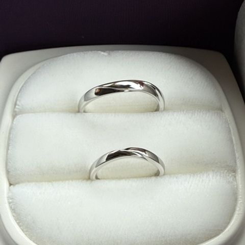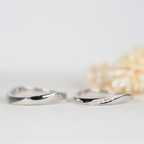 シンプルなデザインでありつつも女性リングは片面にメレダイヤモンドが埋め込まれており、豪華さもある。 男性リングはストレートの形に真ん中が絞られているデザインで動きがありシンプルすぎない 形はストレートではあるが動きのあるようなデザインの為 ウェーブがかったようにも見えて色んな指タイプでも合うと思う