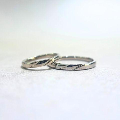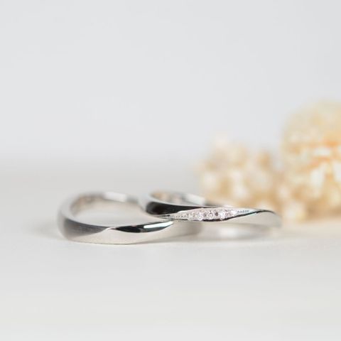 ウェーブデザインがオススメポイントです。シンプルすぎず派手すぎずちょうどいいデザインだと思います。ただまっすぐなデザインでは物足りないがそれほど主張が激しくないものがいい肩にはオススメです。また、女性のリングには1つダイヤもついており、複数個ではなく1つというのがさりげなく良いアクセントになっていると思います。