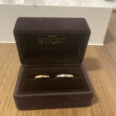 指輪はシンプルなデザインでお互いの指輪が同じデザインではないが、同じ素材を指輪に取り入れることでデザインは異なるがお揃いの部分もあるというお互いに素敵な指輪ができました。また私の友人が接客をしてくれたので大好きな友人に相談に乗ってもらいながら完成したとても思い入れの深い指輪になりました。