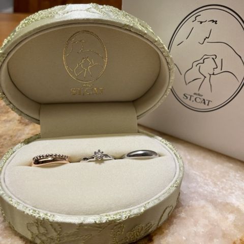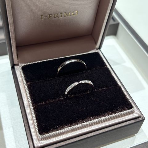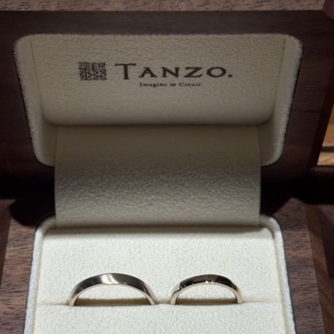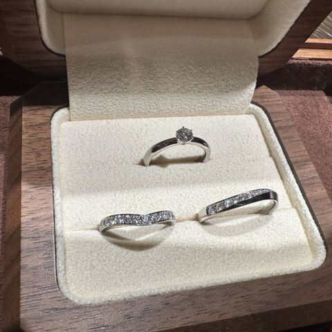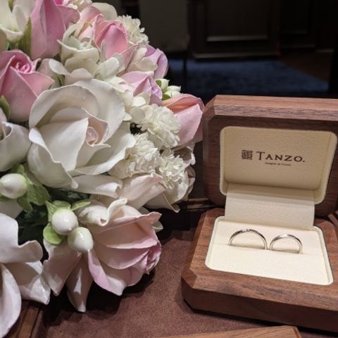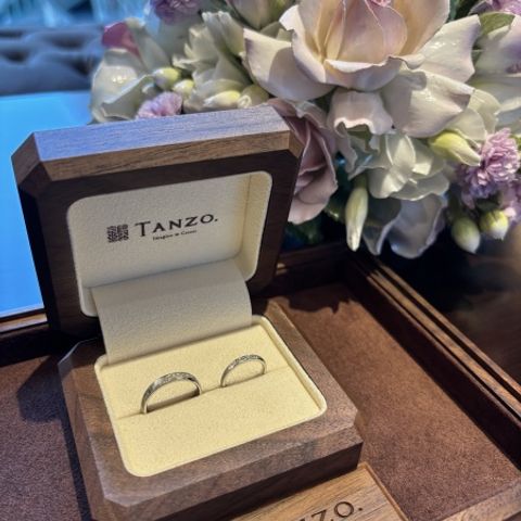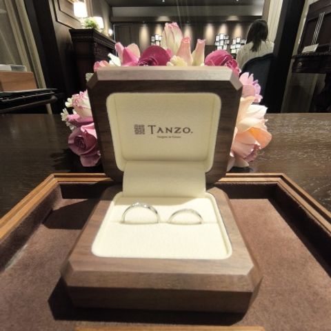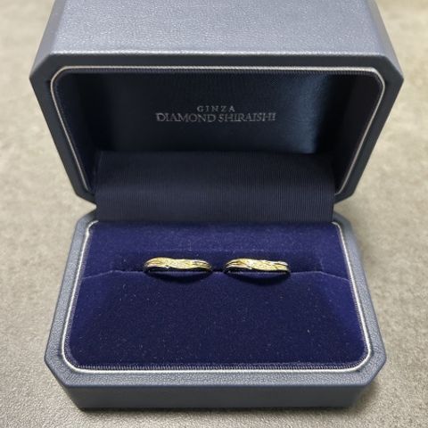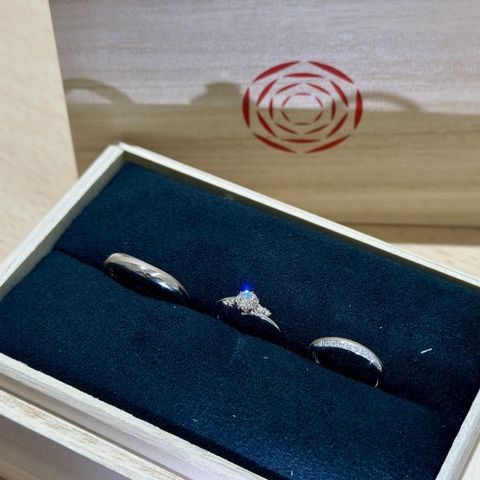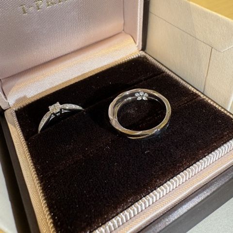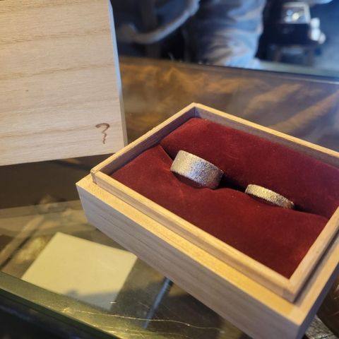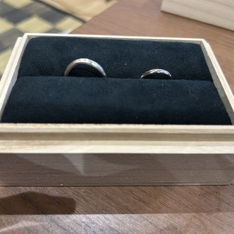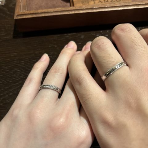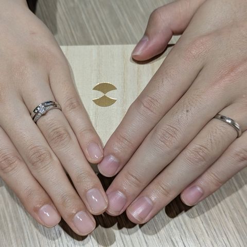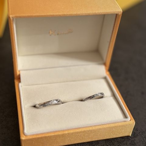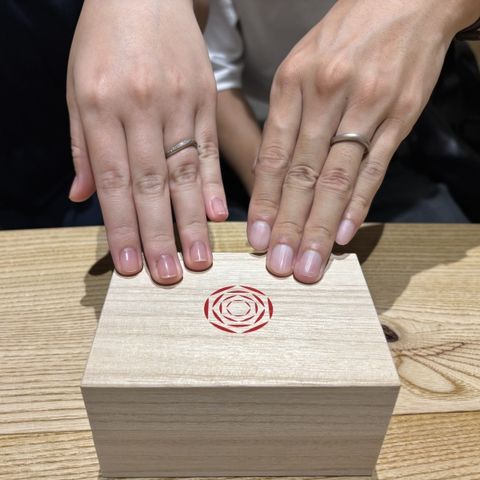 和を基調としたシンプルなデザインですが、綺麗な曲線と輝くダイヤモンドがとっても素敵です。自分たち好みに素材や色などをアレンジした指輪を職人さんが丁寧に作ってくださるのも嬉しいポイントでした。指輪が入っている木箱もどこからが蓋か分からないほど丁寧な作りで、開ける前から感動、開けて輝きにもっと感動!と幸せな瞬間でした!