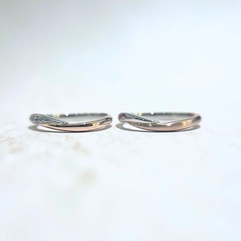 プラチナとピンクゴールドの2色の金属が入っているのでシンプルなだけでなくおしゃさも兼ね備えた指輪です。2つで1つの形になるようなウェーブがなっているので特別感があります。女性側の指輪の宝石の数も選べるので好みのデザインにできるのも良かったです。