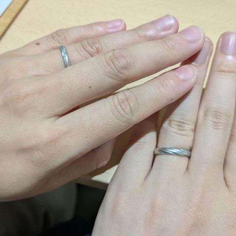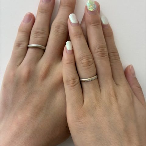 夫婦になって初めての共同作業として、指輪を手作りしたので思い入れが強い。ウェーブの形は最近の流行なので、目新しさがある。夫婦で形を揃えたのもあり、特別なペアリングとして完成している。さらに、中に刻印を入れて特別感を増やした。