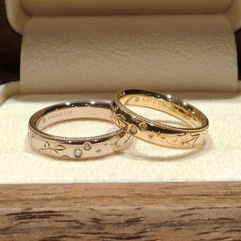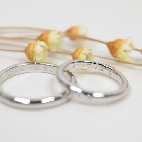 さくらの季節に出会っていて、2人のリングを重ねるとさくらの模様になるのがとっても可愛くてお気に入りです。 外側のラインも2人で同じなのでシンプルだけどお揃い感があってとてもよいと思います! また、刻印ではニコちゃんマークも入れられるので日にちの端に入れちゃいましたっ!