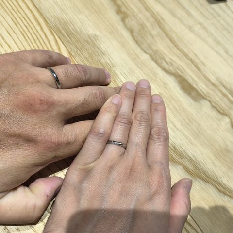 ベースのデザインからすべて、自分たちの理想のものになるように作ることができました。様々な組み合わせも見たうえでお気に入りのものが出来上がりました。小指に沿って曲がっている形で着け心地もとても気に入っています。
