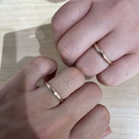 シルバーすぎずゴールドすぎない、手に馴染むシャンパンゴールドの色を選びました。夫とは色は違いますが、同じふわふわのデザインにするとこによってセット感を出すことができました。また、婚約指輪がなかったのでダイヤを1つ入れてもらいました。