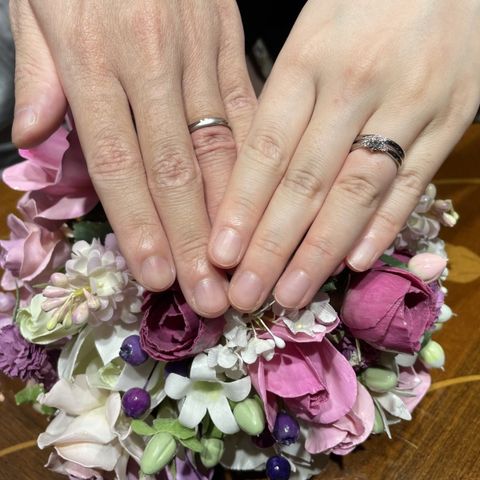 シンプルなデザインが良いと決めていましたが、やはりキラキラしているもの、デザイン性があるものにも惹かれたり、マット加工の物も素敵で一概に決めきれない… と優柔不断な2人が、好きなものを詰め込んだデザインにしました。当初ダイヤはいらないと思っていましたが、付けて正解でした!