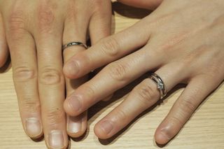 手と手が合わさっているような雰囲気。 とてもシンプルで女性の方のリングも石がついていないので、日常的につけても自然と馴染む感じがあります。 男性の方のリングも細めのデザインなので、つけていても邪魔をしない良いデザインだと思います。