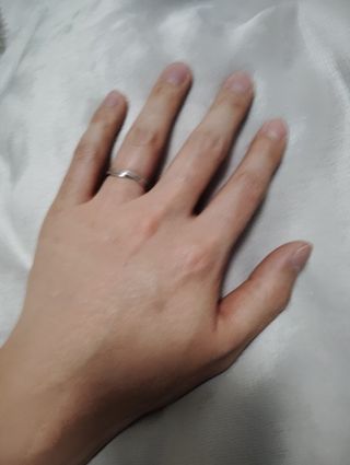 毎日つけていても気にならないような付け心地の良い指輪です。軽くて薄いので、付けていることを忘れるくらい馴染みます。指を閉じた時に痛い、気になるといったことが全くないです。裏面が平らで指にフィットしてくれるので、私のように関節が細いタイプでも落ちる心配がないのも魅力でした。