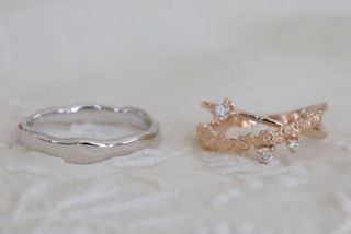 mina.jewelryさんの指輪は、地金の色や形状を自分好みにセミオーダーできるので、夫婦でお気に入りの結婚指輪を作ることができました。シャンパンゴールドの色味は、肌に馴染んで私服にも合わせやすく、毎日つけてても飽きがこないです。他のブランドではあまり見かけないような、シンプルだけど遊び心のあるデザインも気に入っています。