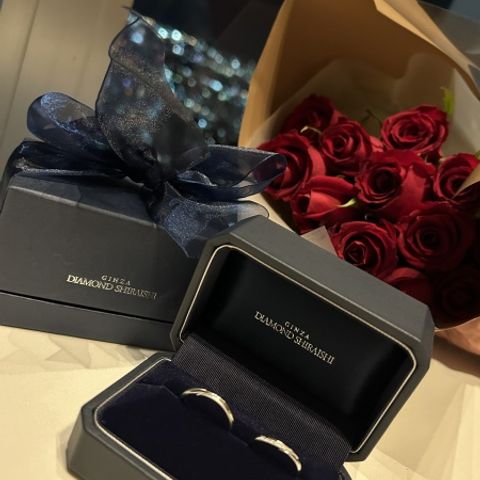 様々なブランドの指輪を見に行きましたが、この指輪で初めて彼と私の意見が一致しました。 他には無いデザインで、男性用のリングの正面にマット加工がされているのがとても気に入りました。 女性用のデザインのダイヤは正面ではなくサイドから流れるように入っているので、仕事中でもギラギラせずつけられると思います。