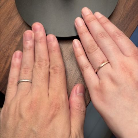 妻はゴールド、シルバー、ピンクゴールドのスリーカラーを、夫はシルバーリングでお互い別々のデザインのものを選びましたが、どちらも横ラインが刻まれているので、2つのリングが揃っても違和感無く着けることができます。