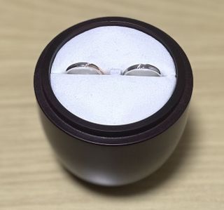 写真では分かりづらいですが、特別な表面加工が素敵で選びました。表面加工のおかげでギラギラし過ぎず、普段使いしやすくて夫婦ともども気に入っています。私は定番のシルバーではなくピンクゴールドにしましたが、肌なじみがすごくいいです。