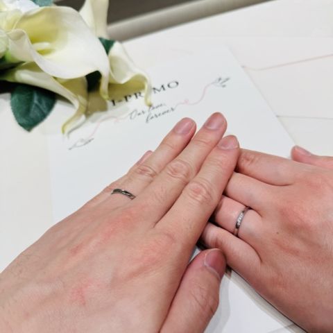 とにかくシンプルなデザインがよく、お店で色々と相談しながら決めました。シンプルな形ながらも、指輪を外して内側を見ると花柄になるようなものにしてもらい、オリジナリティあるものが作れたので良かったです。細かいところまで自分たちで決められるので、オリジナルなものが作れました。