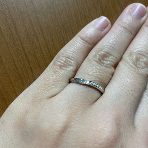 私自身、あまり指が細くないので、指が細く見えるデザインの指輪を探しました。ウェーブのデザインが指先を美しく見せてくれるのと、メレダイヤの輝きが女性らしさを演出してくれるので、手元を見るたびに気持ちが嬉しくなります。