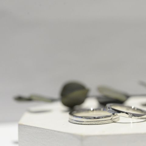 2人ともシンプルなデザインがよかったので出来るだけシンプルにしました。それぞれ好みが少し違いましたが、お揃いらしさは欲しかったので、斜めのラインは共通デザインとし、夫はウェーブの形でマット加工、妻はストレートの形で、石ほどキラキラは苦手だけど少しキラッとさせたかったので斜めの部分の表面に加工をしてもらいました。