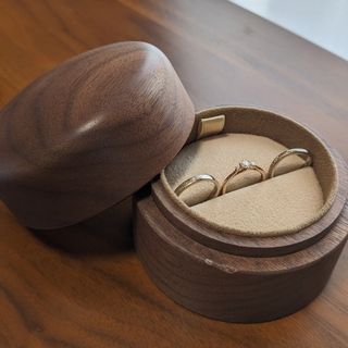 普段カジュアルな服装が多いので、それにあったシンプルな指輪にしました。カラーは無理に合わせずに、お互いが良いなと思うカラーにしました。キラキラ目立つより、手や他のアクセサリーにもなじむように、ホーニング加工に。宝石は内側にひっそりいれてもらいました。