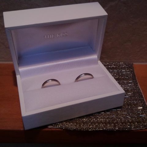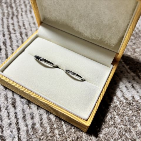 エンゲージリングは、左右非対称なので逆さまにつけても印象が変わるのと、ダイヤモンドになるべく高さが出ないように作られているので、ゴツくならずに綺麗に見えます。 マリッジリングは、小さいダイヤがカーブするように付いているので、着用したときに正面だけでなく奥から見ても手前から見てもキラキラとしていて綺麗です。 男性用のマリッジリングも、マット加工をしてもらい、少し個性をもたせられたのが嬉しかったです。