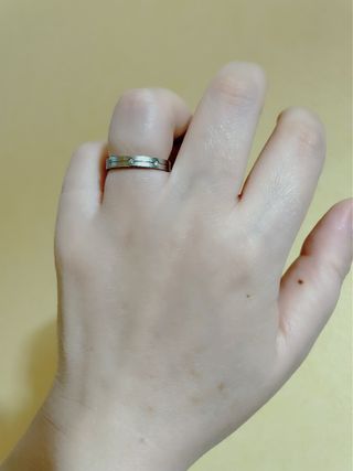 シンプルでキラキラもしてるけど派手すぎず毎日つけてます。こだわりが強くて、いかつくならないように細めのデザイン+ブルベの為シルバー+スクエアタイプ+小粒のダイヤ多めで、自分の指にも似合うよう色んなサイトを見まくってました。とっても可愛い指輪です。後から知ったんですがダイヤが半分だけついてるデザインの指輪は気分で向きを変えることもあるそうです。私はキラキラの部分が外側にくるように毎日つけていますが。笑