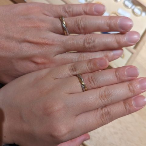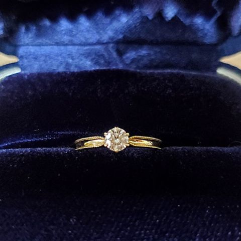 記念になる事がやりたくて、こちらの指輪を選びました。純金糸を結ぶセレモニーは、思った以上に糸が固かったことに驚きましたが、担当の方に要所要所で優しくお声がけいただいたおかげでうまく結ぶことができ、とても良い思い出になりました。 ウェーブの部分が指にしっくりときて、指長にみせる効果もあります。また、アレンジでダイヤの有無・個数を選ぶ事ができ、満足いくものになりました。