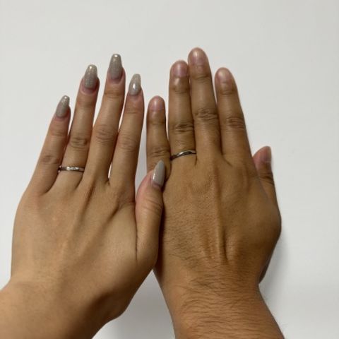 2人のデザインは違うけどペアなのが良かったです! 着け心地も良くて、デザインもとても良いです。 彼の指輪がマット加工がされていて普段の服装にも合うデザインでとても気に入っています。 長く付けるものなのでシルバーにしました。