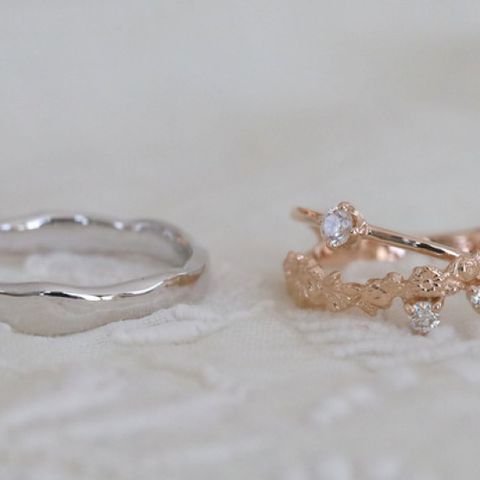 婚約指輪のウェーブがとても綺麗で、正面からみても、自分から見てもダイヤモンドが見えるデザインがこだわりポイントです。 結婚指輪は、ウェーブがかかって細かいダイヤがついているものがよく、捻りすぎていないバランスの良い指輪です。