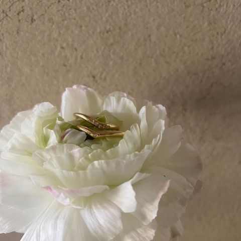 【mina.jewelryにした決め手】 ・2人ともmina.jewelryのピンクゴールドの色が気に入った ・自分たち手書きの刻印が入れられる ・好きな形のものが作られる 【エンゲージリング】 どこから見てもキラキさせたくて、鏡面且つ、小さい槌目を全体に入れてキラキラ感を出しました。 ダイヤモンドがお花のように見えるため可愛いくて気に入ってます。 【マリッジリング】 リングの太さが前後で違う「うつり」というデザインで、太いリングを付けたいけどデザイン性も欲しいということで、選びました。 同じものを身に付けたかったので、リングのサイズだけ異なっており、リング幅などの他は全く同じものにしました。