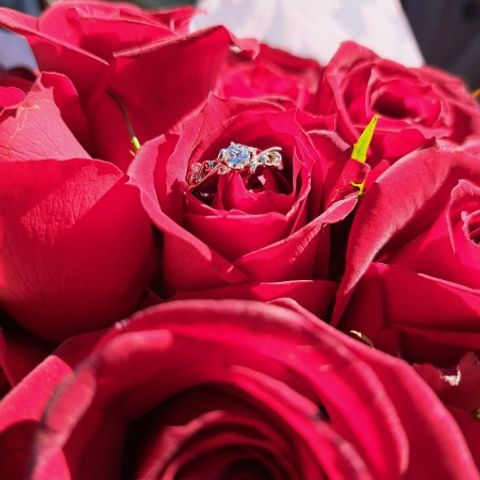 指輪のデザインはもちろん裏には日付やイニシャルまで入れられ埋め込み式のダイヤを飾ったとても可愛らしいペアリングです。また職業柄あまり派手な指輪を付けられなかったので埋め込み式という方法で私の理想の指輪を作ってもらいました。