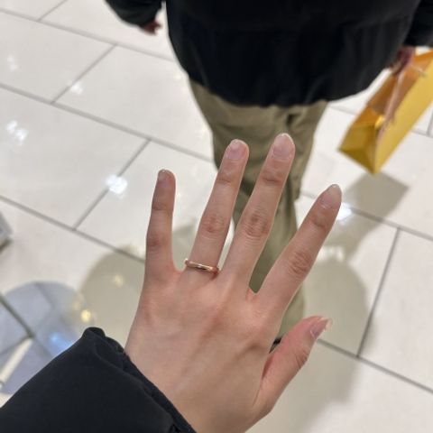 普段使いできるシンプルなデザインで、なおかつオリジナリティが少し入った可愛いデザインだと思います。もともとはシルバーとゴールドのデザインでしたが、ゴールドが得意ではないのでシルバー一色に変更していただきました。普段のどんな洋服にも合いますしウェーブラインで指を綺麗に見せてくれるのでとても気に入っています。