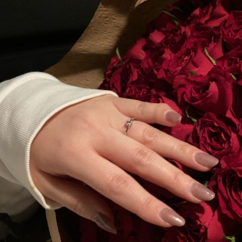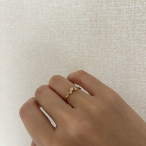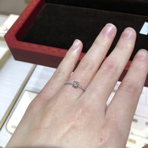 個人的に、まさしく婚約指輪のようなものはあまりピンと来ず、もう少したまのお出かけでも使えそうなカジュアルっぽいものが欲しいと思っていました。ネットで見て華奢なデザインが素敵だと思い、実物を付けて一目惚れ。キラキラが堪らなくかわいいです。