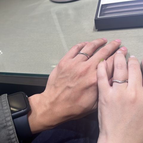 指輪を着けた彼女の手がとても綺麗に見えました。 ハート&キューピットでカットされたダイヤが素敵に輝きを放っています。 全く種類の違う指輪でしたが 洗練されたプラチナのデザインが2人の中でこれならお揃いの指輪として成立するなと思い決めました。 元々ウェーブのかかった彼女の指輪と つや消し加工でウェーブを表現された僕の指輪が 決め手になりました。