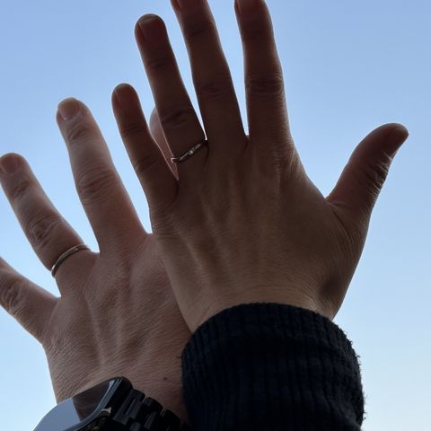 婚約指輪は立て爪デザインではありつつも頻度高く身につけれるもの、他のデザインと被らないものを探しており、小ぶりでお花のようなデザインがどストライクでした!結婚指輪は形だけでなく、削り加工なども選択できるため、他のファッションリングとも馴染むけど、キラキラする削り方なのでそれなりに存在感も出せていて気に入っています!