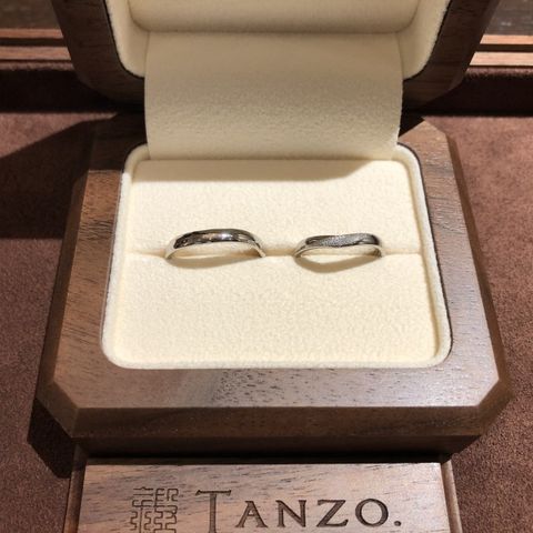 女性の方は指輪の形をウェーブにしたり、それに沿って流れるようなダイヤモンドをつけてもらいました。男性の方は、他店で一目惚れしたデザインを参考にして作りました。半分マット仕上げ、半分はツヤ加工を施してそれぞれのこだわりをたくさん詰め込みました。