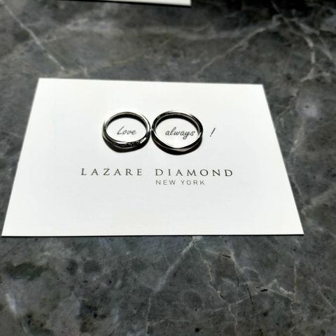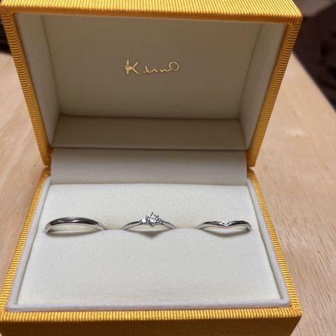 結婚指輪は新郎新婦ともにお揃いデザインで、華奢なデザインとひねりのような形が素敵で、ダイヤも華奢ながら煌めきがとても綺麗でした。 婚約指輪はオーセンティックなデザインでダイヤの輝きがとても綺麗で素敵です。