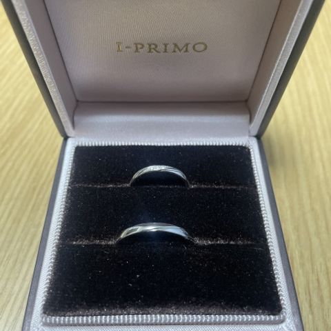 ダイヤモンドが斜めに入ってとても素敵なデザインで、色も自分の好きな色味で選ぶことができてとても良かったです。女性側も男性側も色味や表面のデザインを選ぶことができたので、セミオーダーで自分のこだわりも入れることができました。
