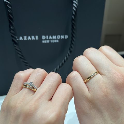 お互いに違う種類の指輪を選びました。 彼はアナエル、私はゼフィロスです。 パーソナルハンド診断をしてもらって、私の指にはウェーブタイプ、彼の指にはストレートタイプが似合うということでそうしました。 診断通り、しなやかなウェーブが指を細く見せてくれてお気に入りです。 ワンポイントのダイヤが華やかではないけど、控えにきらっと輝くのもまた可愛いです。 彼のアナエルは半分マットな加工がされているため、目立ちすぎず、普段使いしやすそうだと思いました。