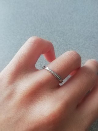 デザインが良かった、メビウスの輪が好きだったために選んだが、結果としてパートナーもとてもよく思ってくれている。シンプルなデザインではあるけれど、フラットではない分、それだけということもなく綺麗に見える。