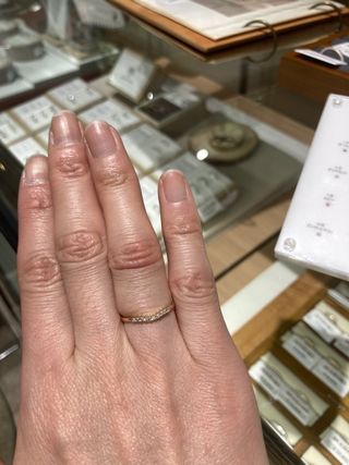 業務上傷がつきにくい鍛造製法の指輪を探していました。 付け方によってはハーフエタニティっぽさもあり、シンプルなデザインに見えたりと角度によって楽しめるので、婚約指輪との重ね着けにも使えると思って気に入りました!