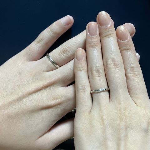 私は真ん中に小さいダイヤが3つ入ったデザイン、彼はシンプルですが私のものより少し太めのデザインにしました。お互い手がそこまで大きいほうではないため細目の華奢なデザインが手に馴染み、着け心地もよかったのでこちらの指輪に決めました。また、私のこだわりで夫婦でお揃いのように見えるデザインがよかったため、ストレートのデザインのものを選びました。今後ずっとつけっぱなしで過ごすことを考えていたため、シンプルで長くつけられるものを選べてよかったと思います。