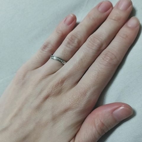 ダイヤモンドが7ピース留まっていますが、華やかすぎず上品に見えます。 シーンを選ばず着用できて、かつキラキラ感もほしい!という気持ちを叶えてくれる指輪だと思います。 形がウェーブ型なので、指が長く見える気がします。 着け心地もよく、普段指輪をつけない夫も違和感なくつけられています。