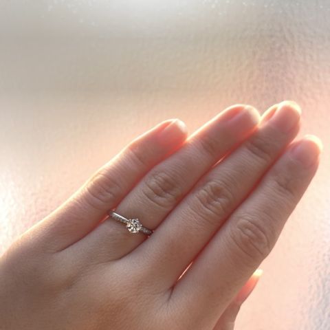 軽くて付け心地がすっごく良いです! 元々婚約指輪はゴージャスなものよりシンプルなものが欲しいと思っていたのですが、一粒ダイヤだけだとなんかちょっと寂しいという方にすごくおすすめのデザインです。 結婚指輪との重ね付けにもすごく憧れがあったので、重ねたときに違和感がないようにしたくて、先に結婚指輪を購入してから、婚約指輪を選ばせてもらいました。