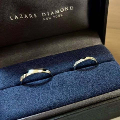 シンプルですが、他のブランドではあまり見ないデザインで惹かれました。女性側のデザインではダイヤモンドが映える配置で設置されており、カッティングも綺麗で光にあたるとすごく輝いています。婚約指輪との重ね付けもしやすいのがプラスポイントでした。